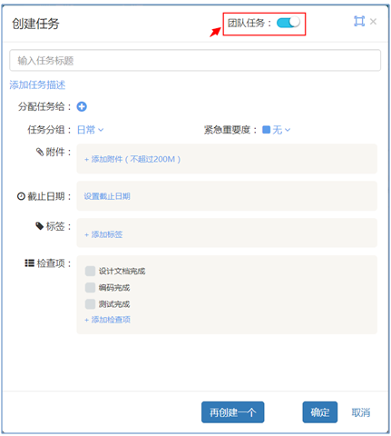 創建團隊任務的入口和方法同上面的任務創建,不同的是創建團隊任務需要把團隊任務的開關打上,如下圖紅色框線區域顯示。