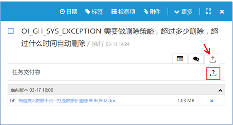 點上圖中的紅色框線區(qū)域的“上傳”按鈕即可選擇文件進行上傳,上傳成功后會在任務(wù)交付物 列表中顯示。 如果要刪除交付文件,點擊交付文件后面的“刪除”按鈕。