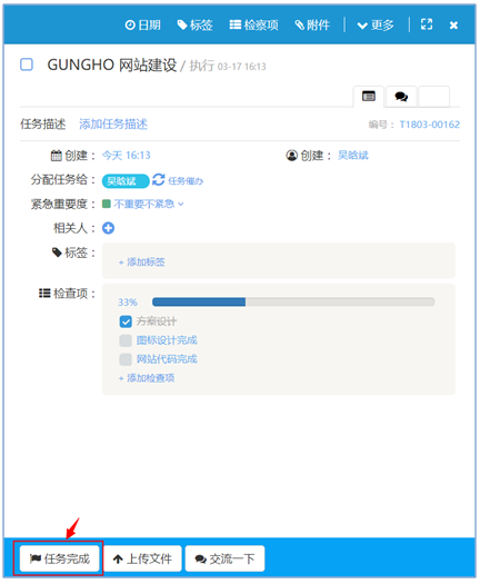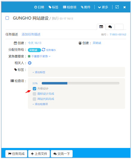 如果任務(wù)在創(chuàng)建時有設(shè)置過檢查點,任務(wù)執(zhí)行人可以在任務(wù)顯示頁面中通過任務(wù)檢查點來設(shè)置任務(wù)進度,如下圖紅色箭頭指處所示:
