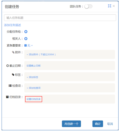 在項目中創(chuàng)建任務(wù),系統(tǒng)彈出的創(chuàng)建任務(wù)彈框會比平常任務(wù)創(chuàng)建彈框多一個歸檔目錄設(shè)置,如下圖紅色框線區(qū)域所示。