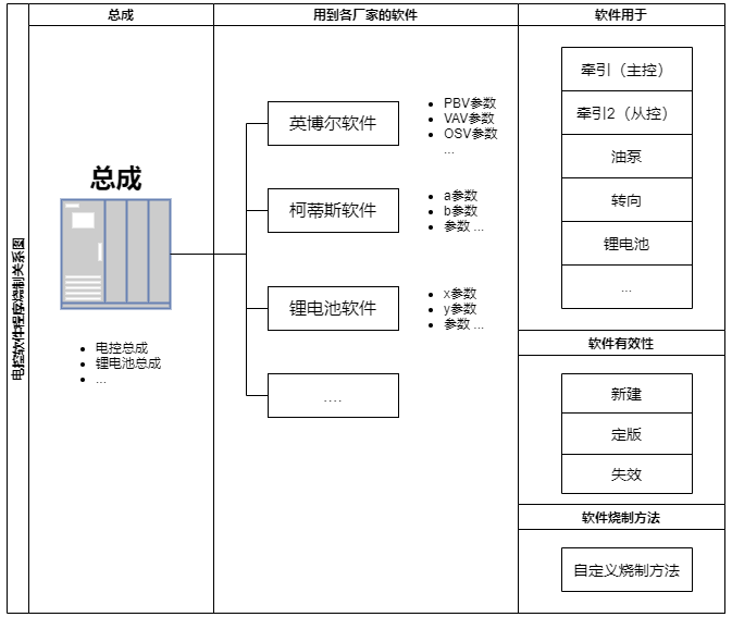 總成(電控總成、鋰電池總成)、各家軟件(參數、版本、用途、燒制方法)