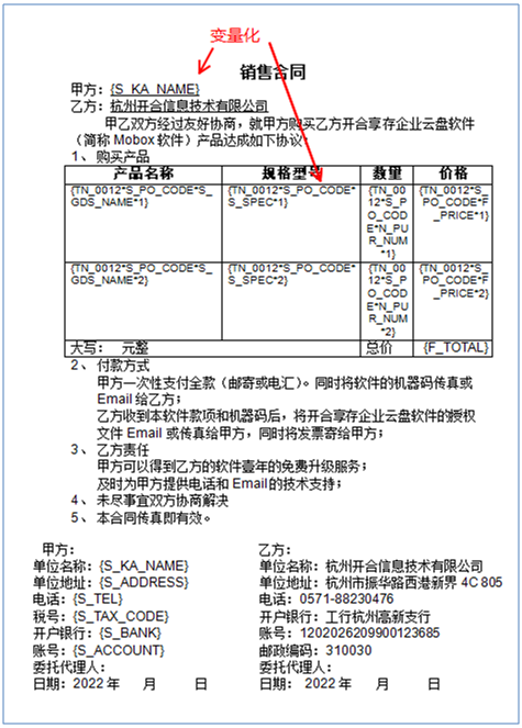- 我們利用企業現有的合同模版,對里面的:甲方、乙方、采購清單、單價、總價等內容先變量化。我們稱之為:格式化合同模版