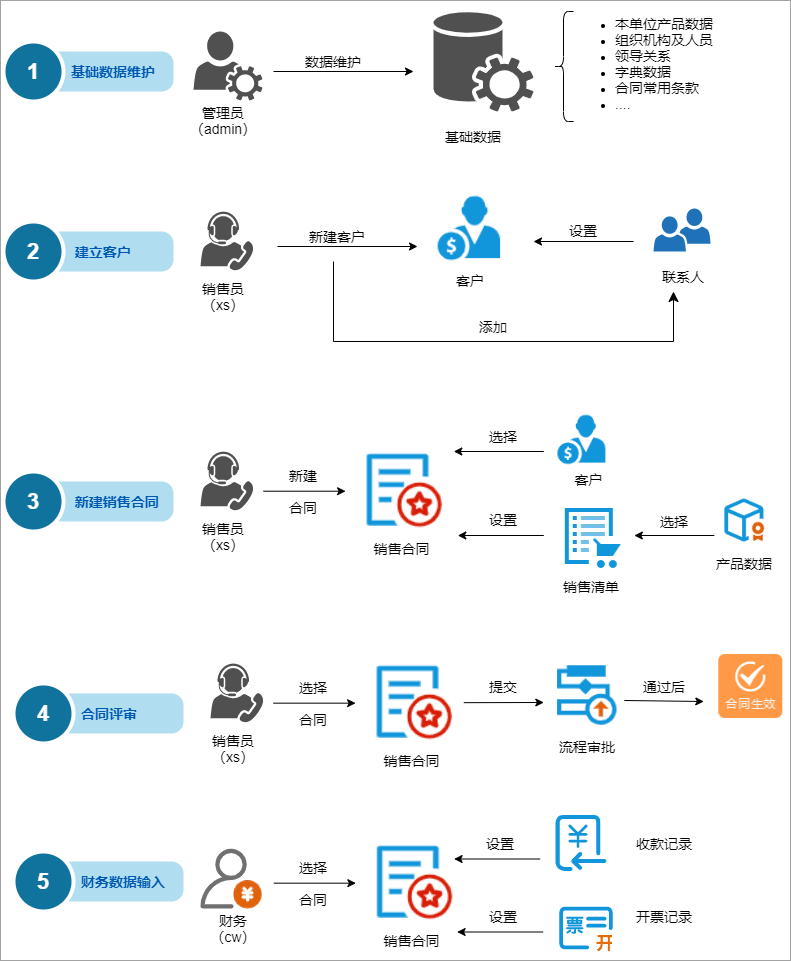 合同軟件涉及的企業(yè)員工角色:銷售、采購、管理員、主管、財(cái)務(wù)。以下是各個(gè)角色主要需要做的事情。