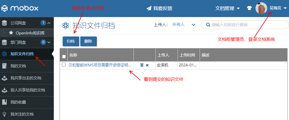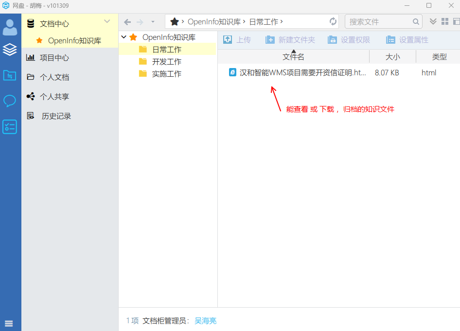 歸檔后,對文檔柜有權限的用戶就能通過文檔系統下載或瀏覽這些知識文件