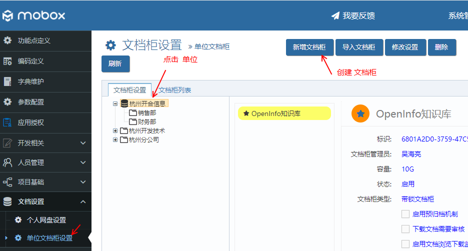 2)在mobox的 “文檔設置-單位文檔柜設置” 里面建立 文檔柜