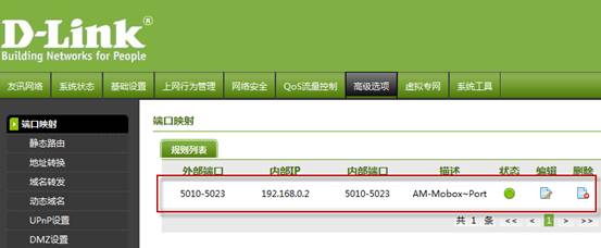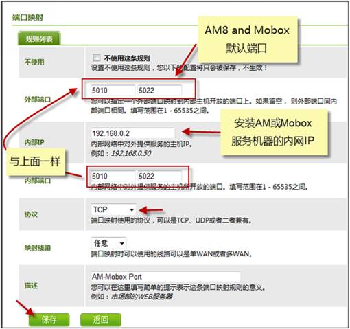 將Mobox企業(yè)云盤相關(guān)服務(wù)所用到的端口(默認(rèn)是 5010~5022)進(jìn)行端口映射設(shè)置,若自己與改過Mobox服務(wù)端的端口,則按實(shí)際的端口配置 (AM即時通的端口也是一樣的)